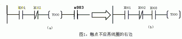 一,PLC梯形階梯都是始于左母線,終于右母線(通常可以省掉不畫,僅畫左母線)。每行的左邊是接點組合,表示驅動邏輯線圈的條件,而表示結果的邏輯線圈只能接在右邊的母線上。接點不能出現在線圈右邊。如下圖(a)應改為(b):