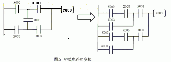 二,接點要畫在水平線上,不可以畫在垂直線上,如下圖(a)中的接點X005與其它接點間的關系不能識別。對此類橋式電路,應按從左到右,從上到下的單向性原則,單獨畫出所有的去路。如圖(b)所示: