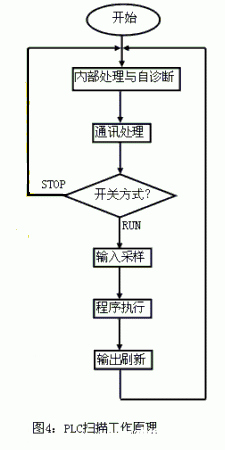 PLC的CPU采用循環掃描的工作方式。一般包括五個階段(如圖所示):內部診斷與處理,與外設進行通訊,輸入采樣,用戶程序執行和輸出刷新。當方式開關處于STOP時,只執行前兩個階段:內部診斷與處理,與外設進行通訊。