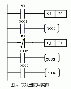 注意:我們所說的是不宜(最好不要)使用雙線圈,雙線圈使用并不是絕對禁止的,在一些特殊的場合也可以使用雙線圈,這時就需要你有較豐富的編程經驗和技巧了。下面我們會談到這一點。但對于初學者還是不要冒這個險。其實,從以上的例子可以看出,重復利用線圈之所以會造成Y003的輸出混亂,是由于程序是從上到下順序執行的緣故造成的。但如果我們可以改變程序執行的順序,保證在任何時刻兩個線圈只有一個驅動邏輯發生,就可以使用雙線圈。其中,最常用的方法就是使用跳轉指令。如下圖所示: