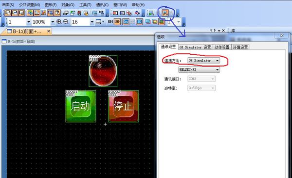 把三菱PLC程序和觸摸屏內容編好,先把三菱PLC編程軟件仿真打開再打開觸摸屏軟件仿真(注意:打開觸摸屏軟件仿真之前要先把連接方式設置成“GX Simulator”,設置方法如下圖。)