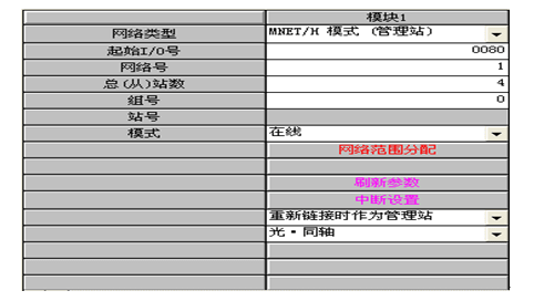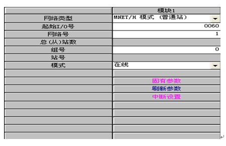 2.軟件設置:通過設置GX-DEVELOPER軟件的網絡參數可對QJ71LP21-25各模塊進行初始化組態,包括起始I/O號、網絡號、從站數(僅控制站可設)、組號、模式、刷新參數等參數。