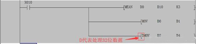 上圖中的例子就是說當X10觸點接通,執行命令MEAN,求3個數據寄存器D0~D2中的數據的平均值,并將結果存到D10中去。